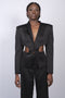 Fitted, single-breasted white satin jacket with oversized shoulders and two front openings. This model is completed with an asymmetrical collar and a double button closure. The model wears a size 36 and is 175 cm tall.