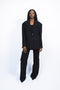 and set in extra fine chocolate-colored merino wool consists of ankle-cut pants as well as a cardigan which features three pockets, one of which is decorated with sequins, and a tie belt made in the same material.