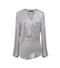 The wrap blouse is fully adjustable to suit your preferences. You have the option to wear it crossed in the back or crossed in the front. Made from raw silk, this blouse features puffed sleeves for an extra touch of elegance.