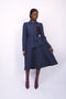 and set in indigo-colored extra fine merino wool consists of ankle-cut pants as well as a cardigan which features three pockets, one of which is decorated with sequins, and a tie belt made in the same material.
