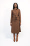 and set in extra fine chocolate-colored merino wool consists of ankle-cut pants as well as a cardigan which features three pockets, one of which is decorated with sequins, and a tie belt made in the same material.